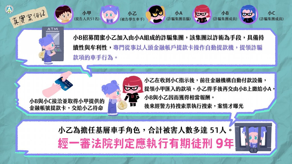 二、近年來學生擔任車手涉詐欺案件數攀升,尤以12至23歲涉案最多,教育部藉由真實案例,解析學生擔任詐騙車手所可能承擔的法律責任,製作本案懶人包,避免學生遭不法分子利用,衍生後續的法律風險與責任。