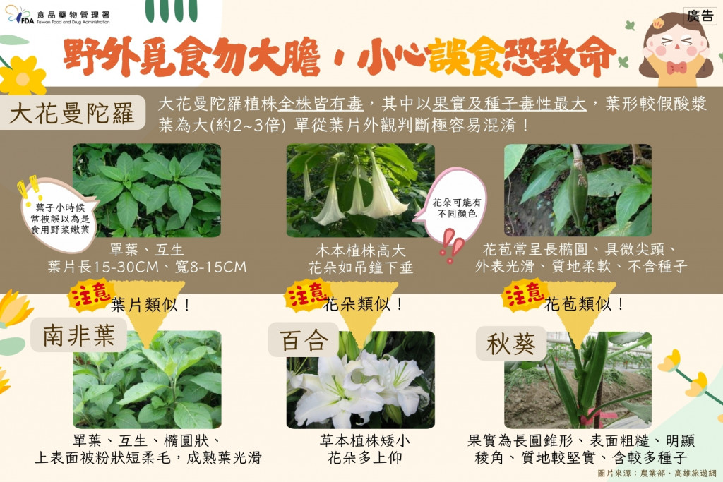 二、檢送大花曼陀羅宣導文宣1 份(如附件)。另有關其他植 物性天然毒(如野生菇類、姑婆芋等)之相關介紹,業已 同步置於本署官方網站「防治食品中毒專區」,網址如下:http://www.fda.gov.tw/TC/siteContent.aspx? sid=11538。請惠予轉知所屬單位廣為運用,並提醒民眾提 高警覺。