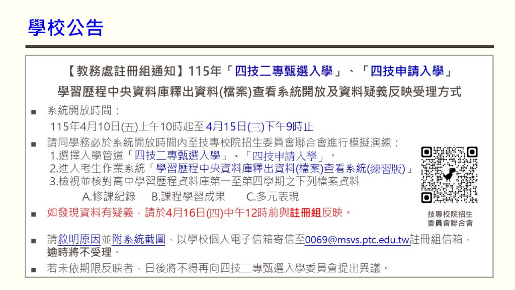 5.請敘明原因並附系統截圖,以學校個人電子信箱寄信至0069@msvs.ptc.edu.tw註冊組信箱,逾時將不受理。